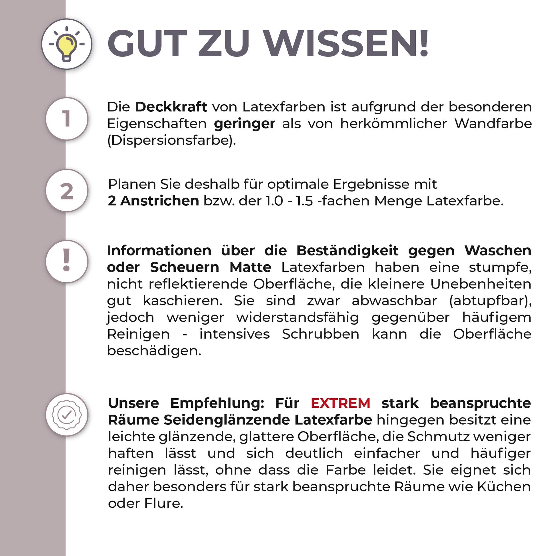 Latexfarben sind strapazierfähig, widerstandfähig und abwischbar. Spritzer, Flecken oder Schmutz können leicht mit einem feuchten Schwamm entfernt werden. Latexfarben eignen sich daher vor allem zum Streichen von stark beanspruchten Wand- und Deckenflächen in Bad, Küche oder Hausflur.